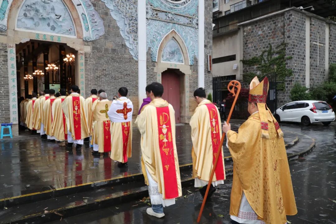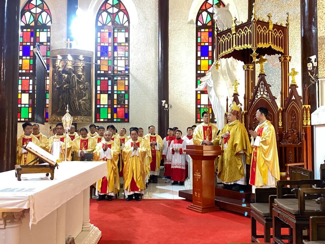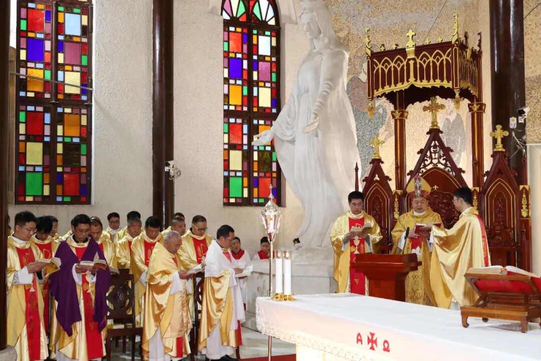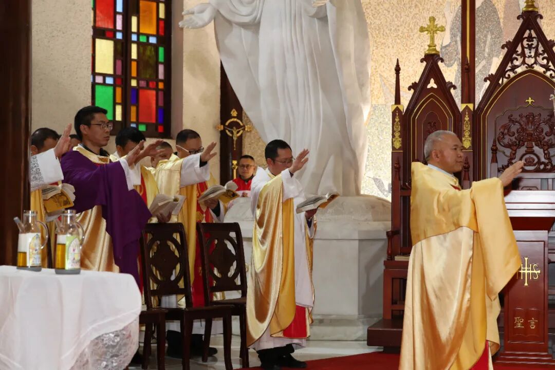 2025年4月12日,天主教贵州教区肖泽江主教携27位司铎和修女、教友们,在贵阳北堂主教座堂举行了隆重的圣油弥撒。为照顾各堂区的牧灵需要及神父修女们的学习安排。